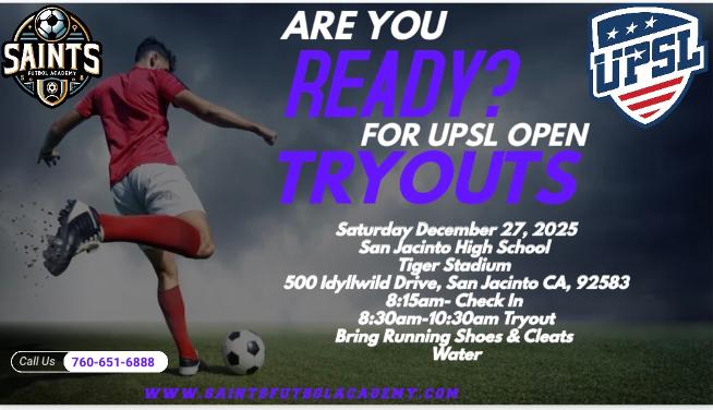 SAINTS FUTBOL ACADEMY IS CURRENTLY LOOKING FOR GOALKEEPERS BORN 2007-2008-2009, SCHOLARSHIP AND UNIFORM DISCOUNTS AVAILABLE FOR THE NEXT GOALKEEPER WHO SIGNS WITH US FORMORE INFORMATION CONTACT COACH ALEX OR COACH ABEL AT 760-651-6888 ORSEE FLYER FOR TRYOUT AND PRACTICE INFORMATION.